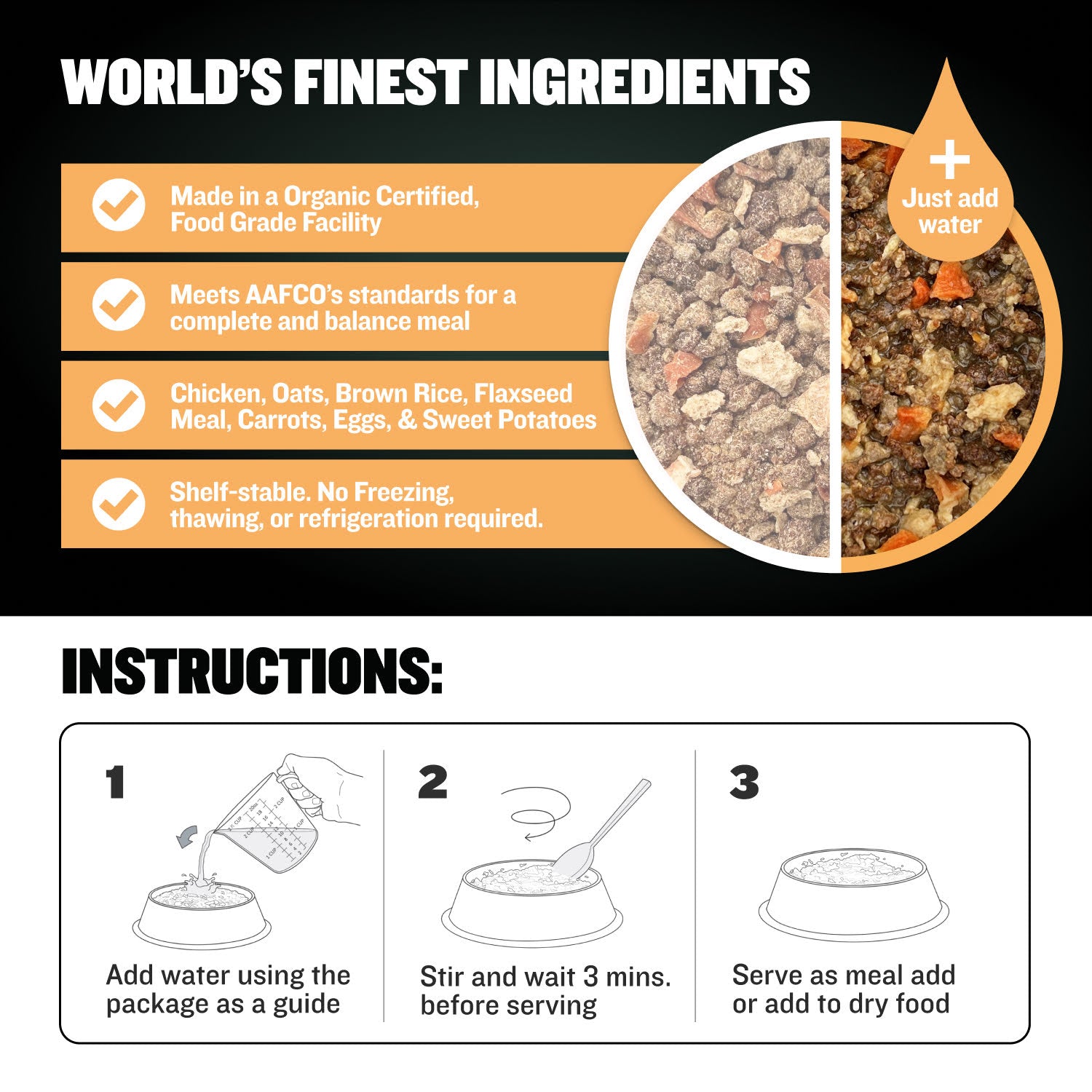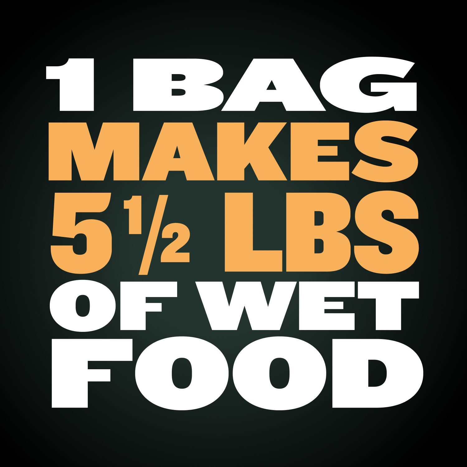 And unlike normal wet food, there’s no need to buy dozens of cans, or have left over, messy food that goes to waste. Instead, all you have to do is add water! Make as little, or as much food as you would like.