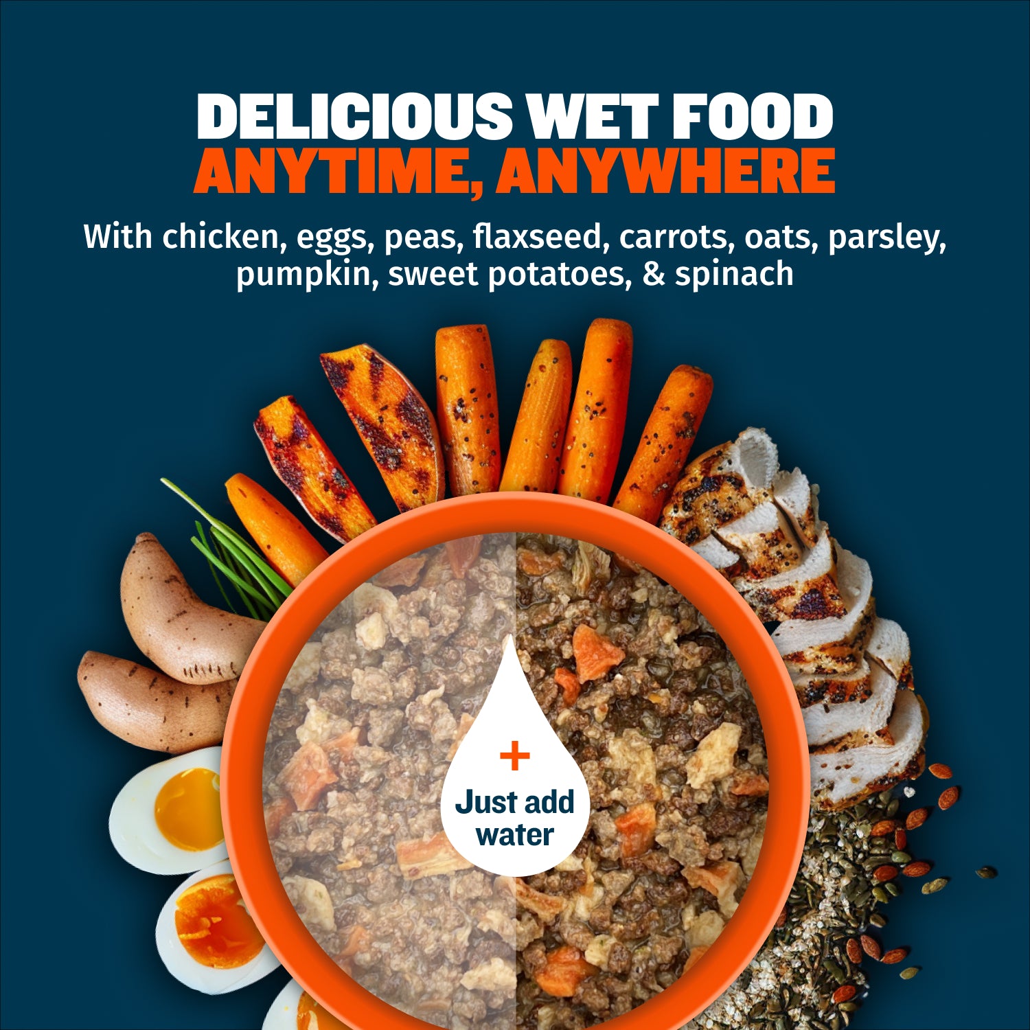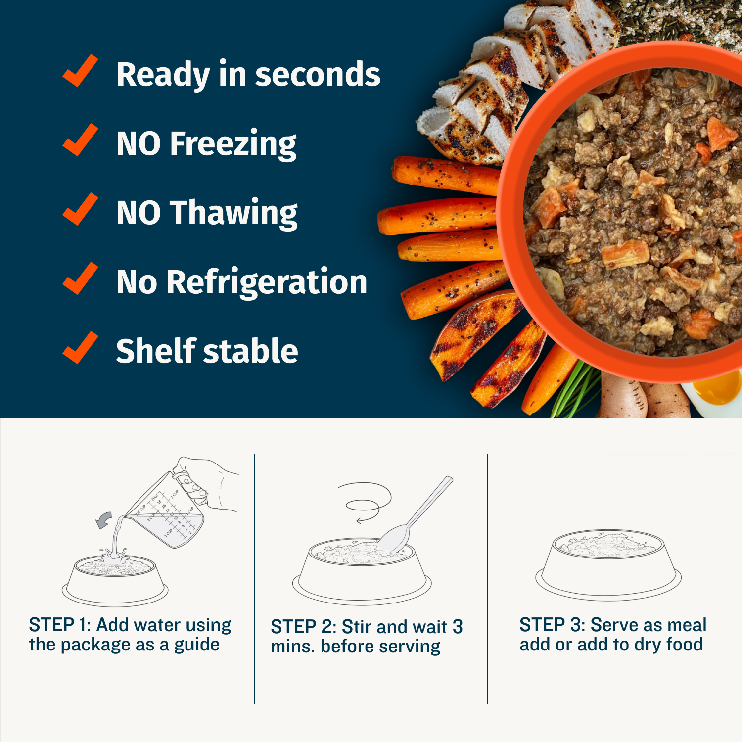 - Minimal prep – Just add water for instantly fresh food in seconds!