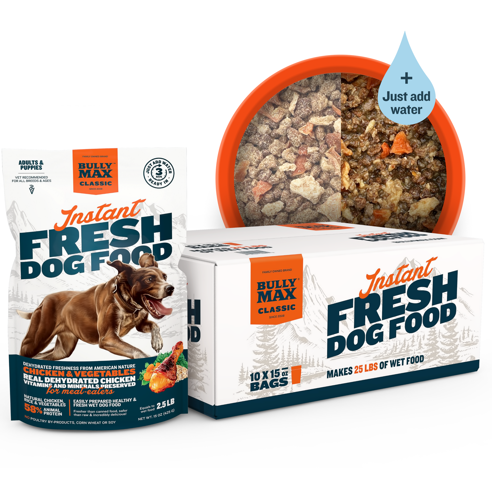 Stock up and save on our Bully Max® Classic Instant Fresh Dog Food, a great raw food alternative, easier to prepare and feed, and just as healthy. That’s all of the health and nutritional benefits of raw dog food, without the work!