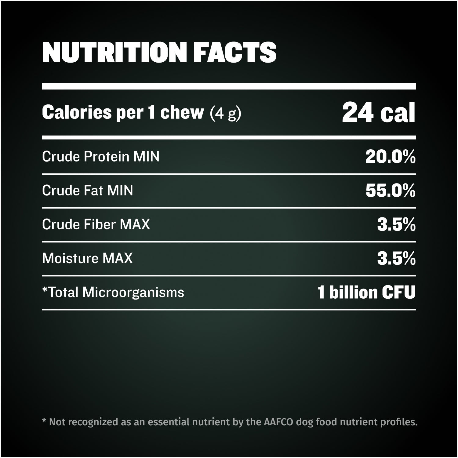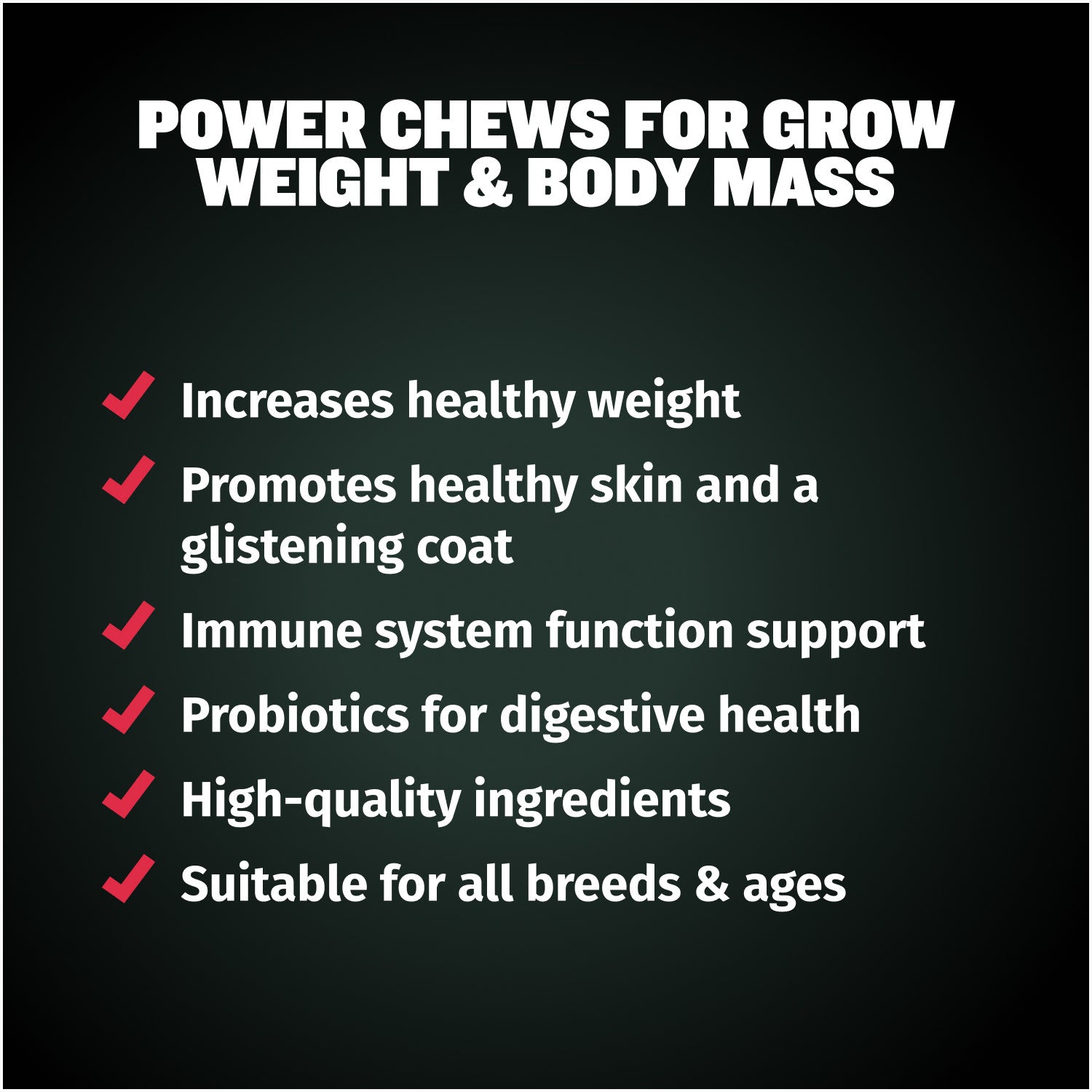 We ensure all our supplements contain only premium, healthy ingredients that will help your dog look & feel their best. Some of the good-for-you ingredients in our High-Calorie Chews include: