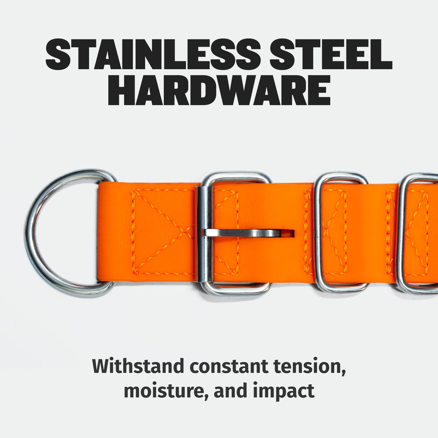 Heavy-duty stainless steel buckle and D-ring stand up to constant stress, moisture, and impact. Won’t snap. Won’t corrode. Won’t let you down.