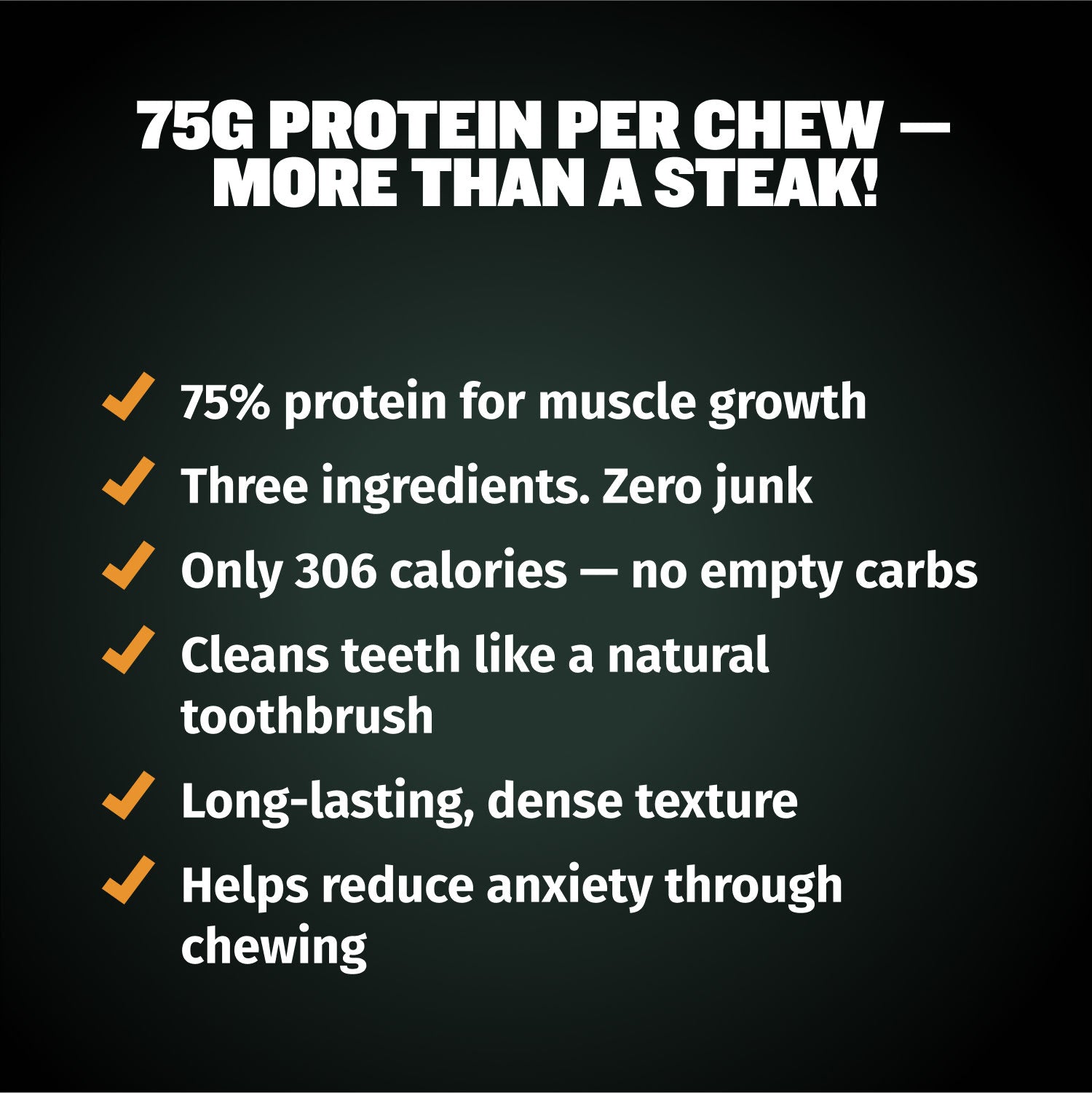 | Crude Protein (MIN) | 60% (≈ 60g protein per 100g chew) |