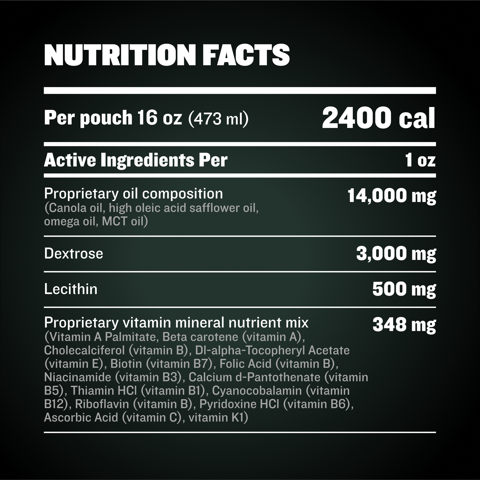 CONTAINS HIGH AMOUNTS OF HEALTHY FATs: Bully Max contains 150 calories per ounce. 130 of these calories are from healthy fats like fish oil as the #1 ingredient. Fish oil is healthy, contains zero trans fats, and has tons of nutritional value..