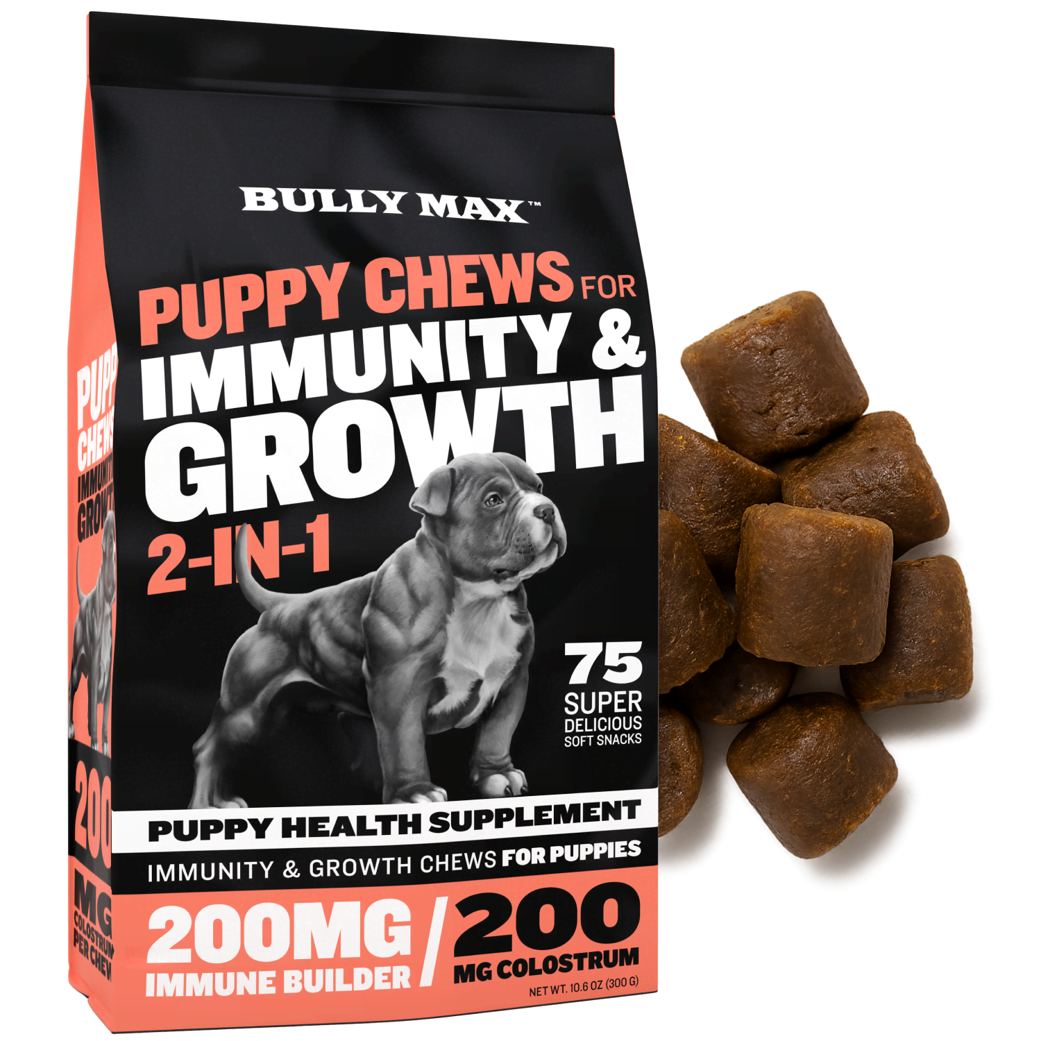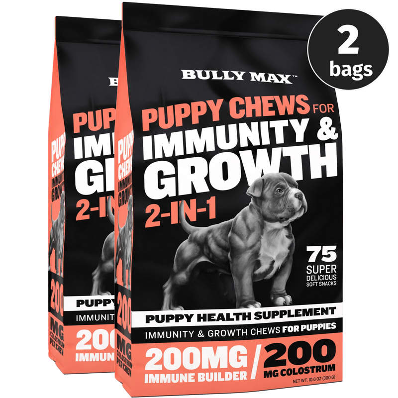 Bully Max® Puppy Chews for Immunity & Growth help to support your puppy's natural growth process during this crucial developmental stage in their lives. Each serving contains a healthy dose of Colostrum, the high-protein component in mother’s milk that helps support growth of your puppy’s muscles and supports their immune system health.